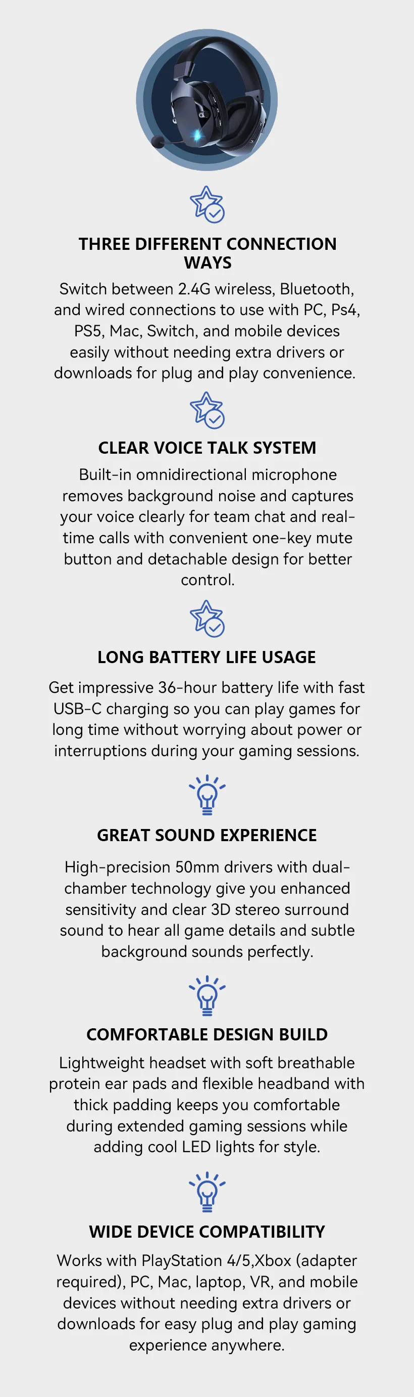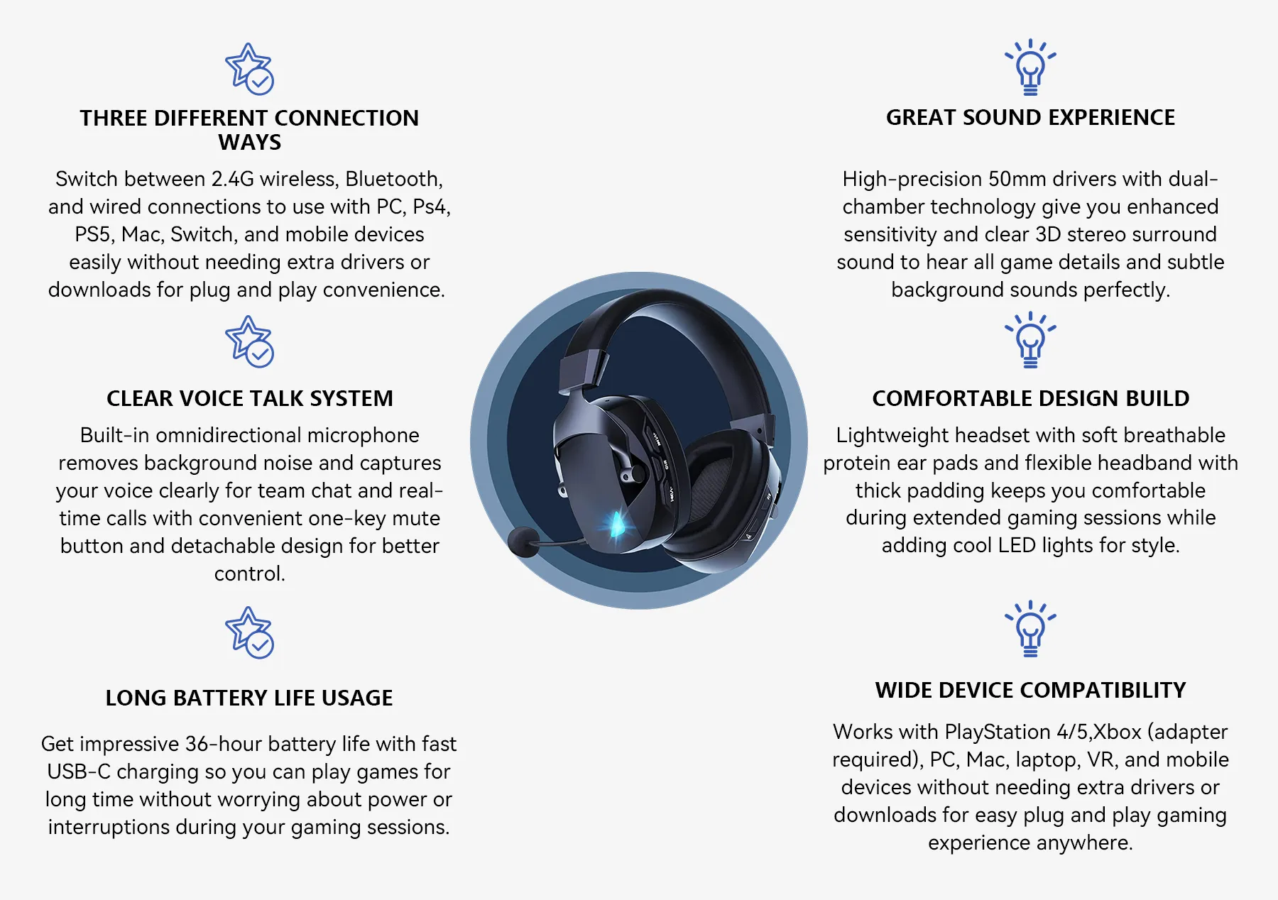 Use three different connection ways with 2.4G wireless USB, Bluetooth, and 3.5mm wired cable that work with PC, PS4, PS5, Mac, Switch, and mobile devices within 10m distance. This gives you flexible gaming options and lets you switch between devices without any problems or extra setup needed.